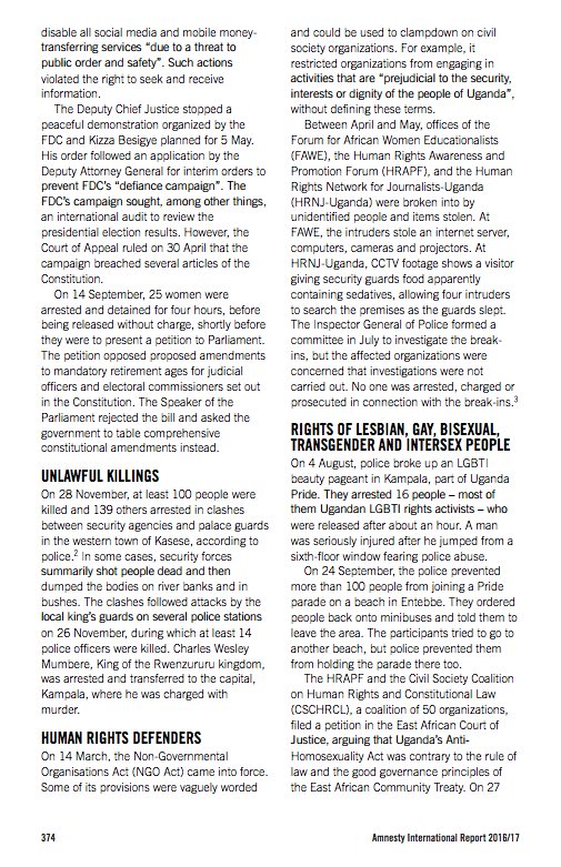 #SocialMedia shutdowns, NGO office break-ins,#LGBTI attacks & arrests -@amnesty report on#Uganda.#AIR17 pic.twitter.com/5gPBQERscs