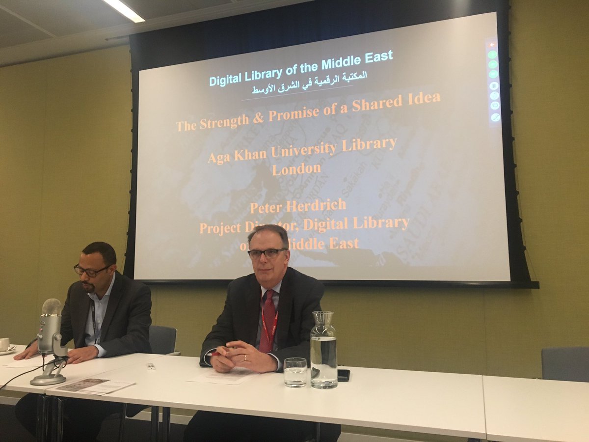 Peter Herdrich and Walid Ghali speaking about the lessons learnt and potential of the Digital Library of the Middle East hosted by the Aga Khan Library , London.