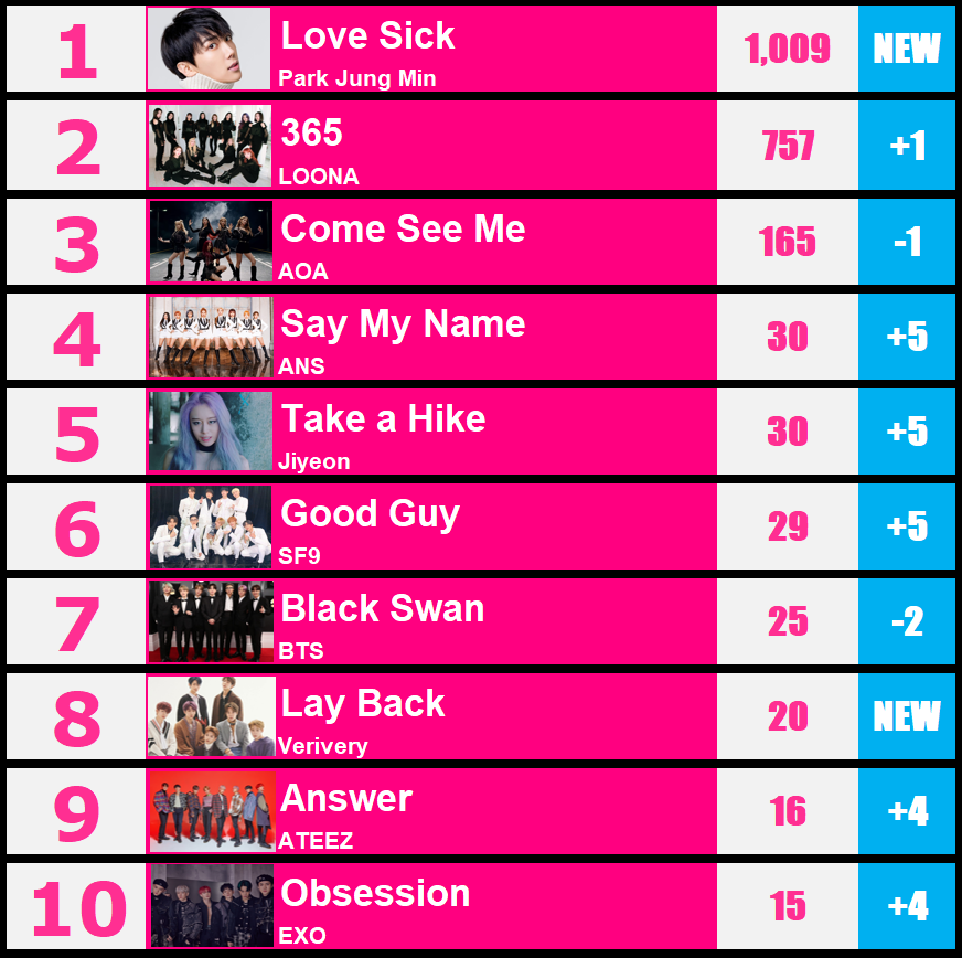 #ParkJungMin Love Sick No2:#LOONA 365 No3:#AOA Come See Me Vote unlimited times here: https://kpopway.com/vote-top-10 Listen to our weekly countdown every Tuesday, 9am KST, here: https://kpopway.com pic.twitter.com/V15PI7pix4