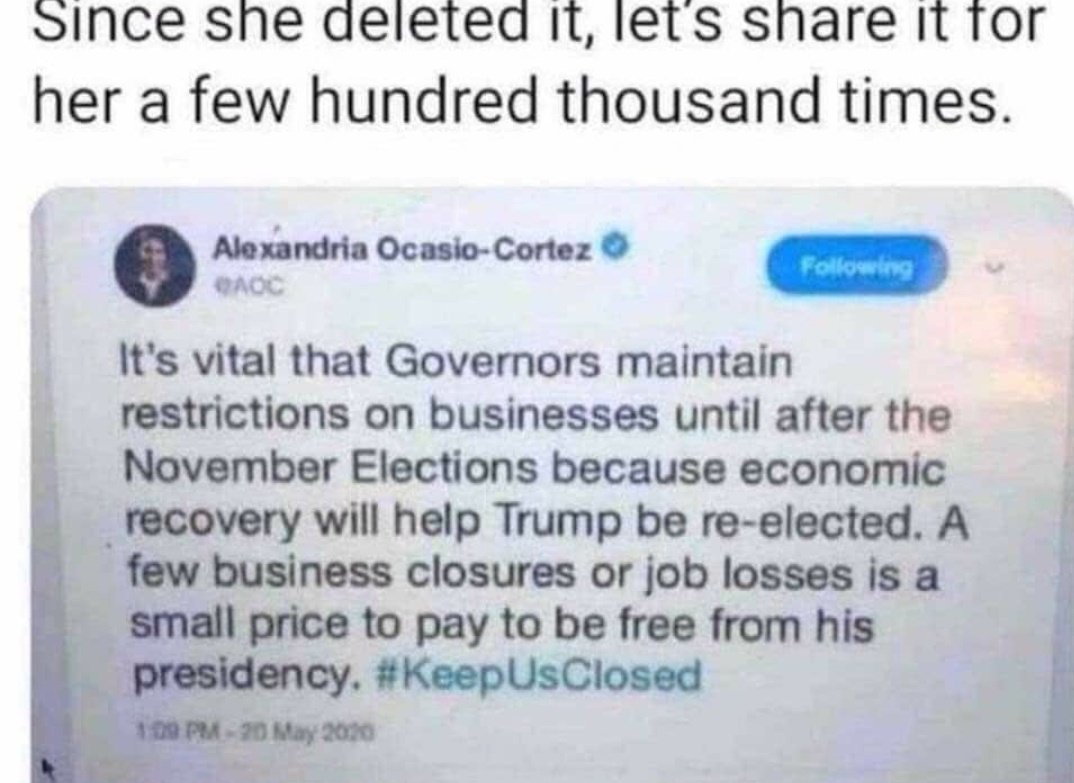 #AOCStillAMoron#SocialismKillshttps://twitter.com/AOC/status/1292155096923504640 … -