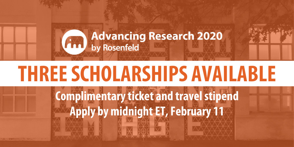 Due February 10, 2020 → Three #scholarships http://bit.ly/2uXv9x6 for researchers & students to attend@RosenfeldMedia’s debut Advancing#Research (@AdvancingResrch) conference in#NewYorkCity, March 30–31. cc:@IITDesign#Business#Design#Tech#CX#UX#AR2020 pic.twitter.com/UB70bWMbda