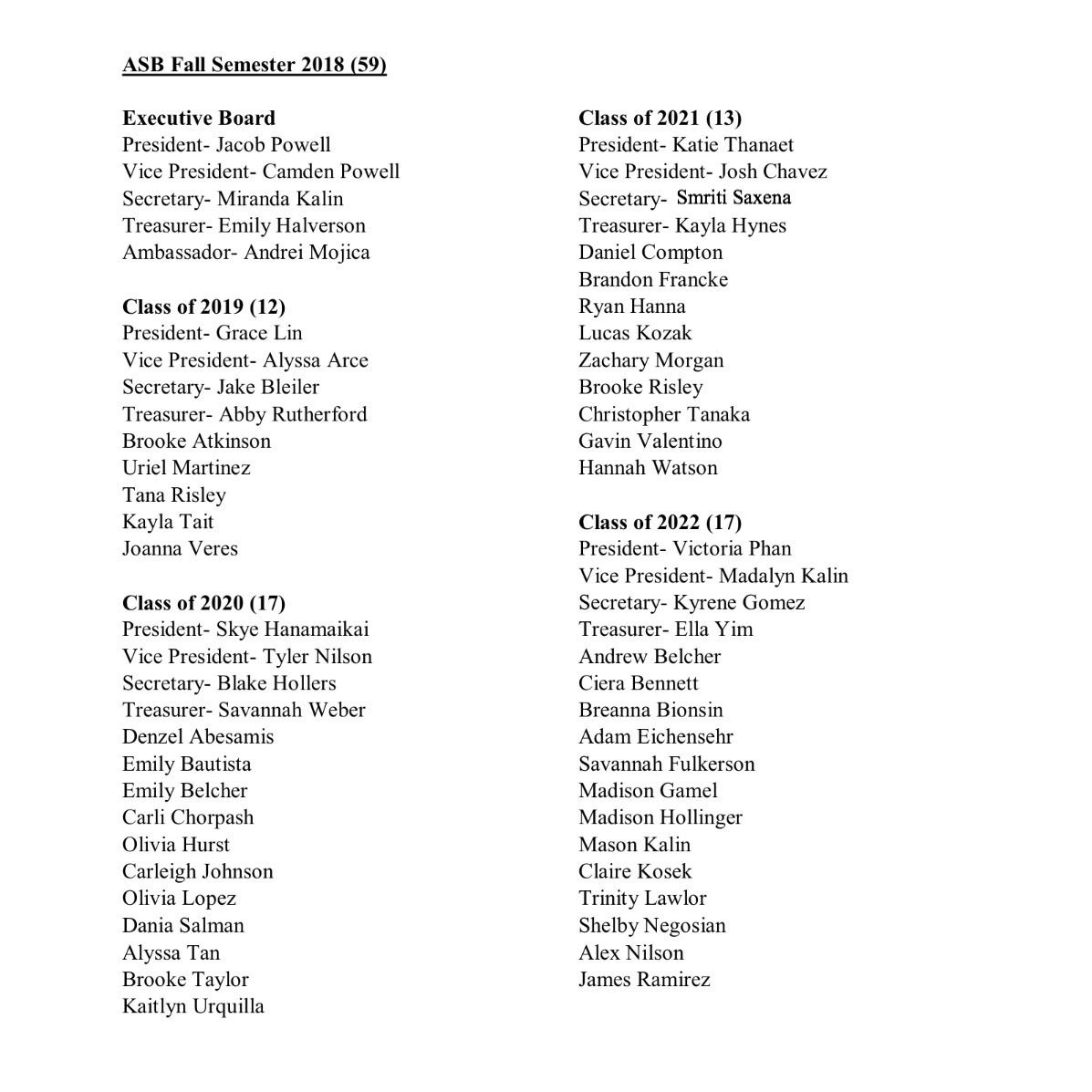Here is the ASB Fall Semester list! Congratulations to everyone that made it, and thank you to everyone that applied!