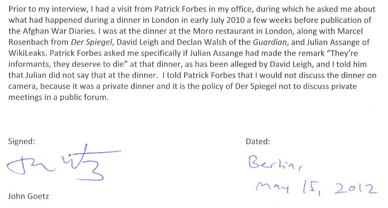#Assange never said that. Was a lie by a rival@Guardian journalist. Signed witness statement by John Goetz of@DerSpiegel.#WikiLeakspic.twitter.com/Q78i7Vfg6o
