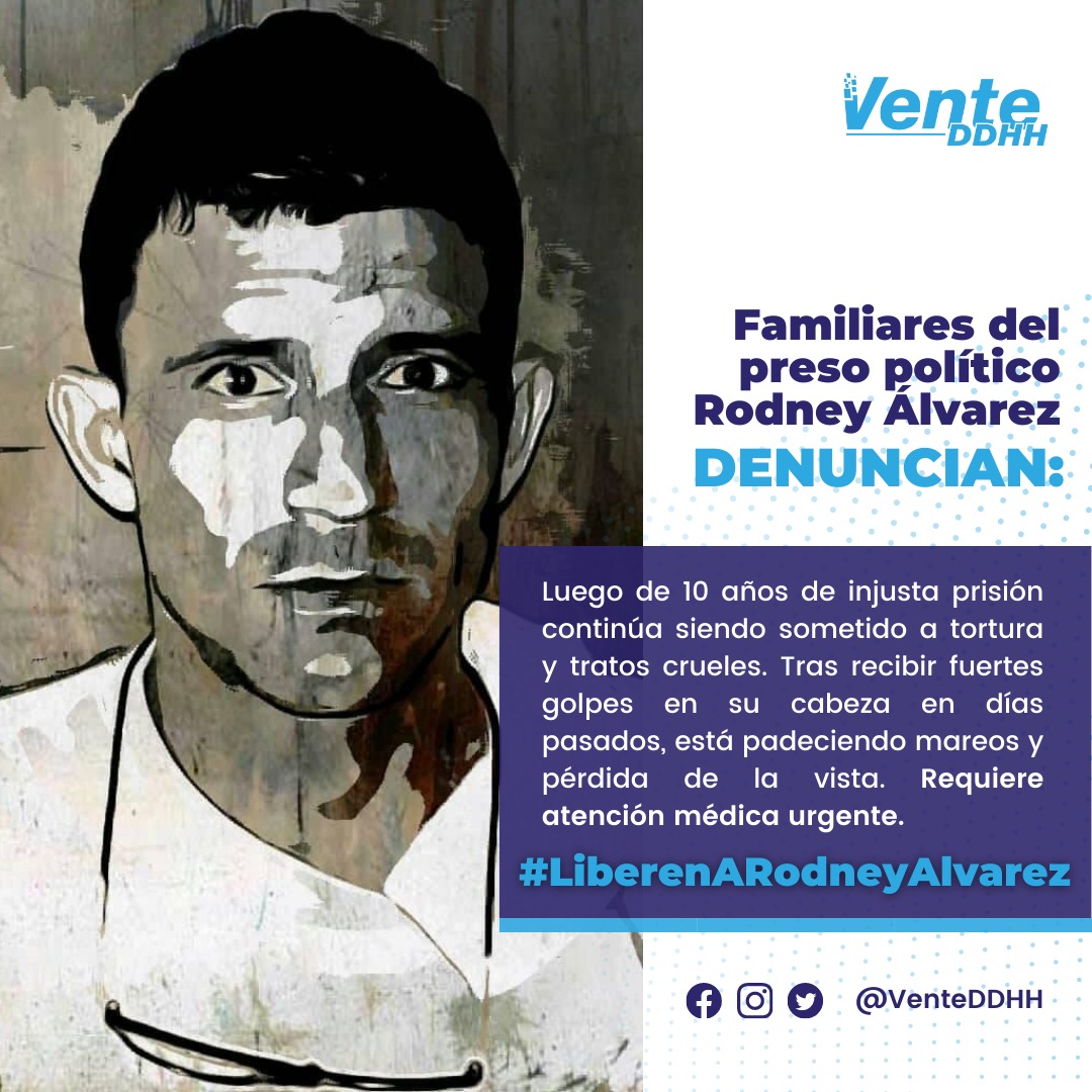 #Atención | El preso político, Rodney Álvarez, está presentando mareos y perdida de la vista, producto de las torturas recibidas por cuerpos represores del régimen. Maduro es responsable de lo que le ocurra. Exigimos atención médica urgente y que#LiberenARodneyAlvarezpic.twitter.com/aiH2I1DKmj