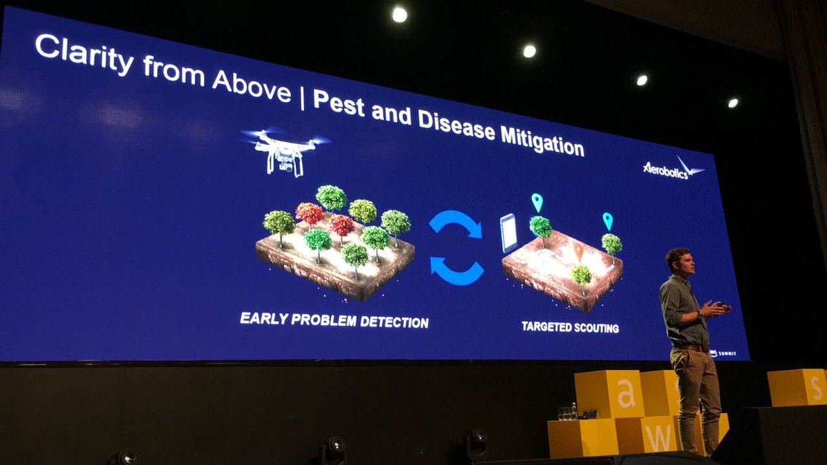 #AWSSummit talking about the future in software using AWS' services in order to help farmers on a tree by tree basis, using drone and satellite imagery and will soon do it on a leaf by leaf basis. pic.twitter.com/VU6GSexhTa