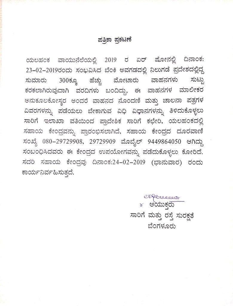 documents and #DrivingLicenses at#AeroIndia2019 fire accident can approach the RTO. The dept has opened a helpline & will be active on Sunday.