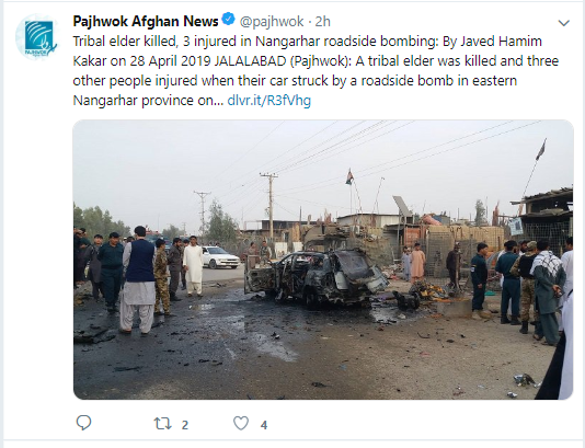 #Taliban failure! A tribal elder was killed and three others were injured by a roadside bomb in Jalalabad.#Taliban claim they are an army for the people but they kill more#Afghans with these bombs than anything else. Listen to the will of the people bring#peace. @Zabiullah_4pic.twitter.com/2io5HHICWw