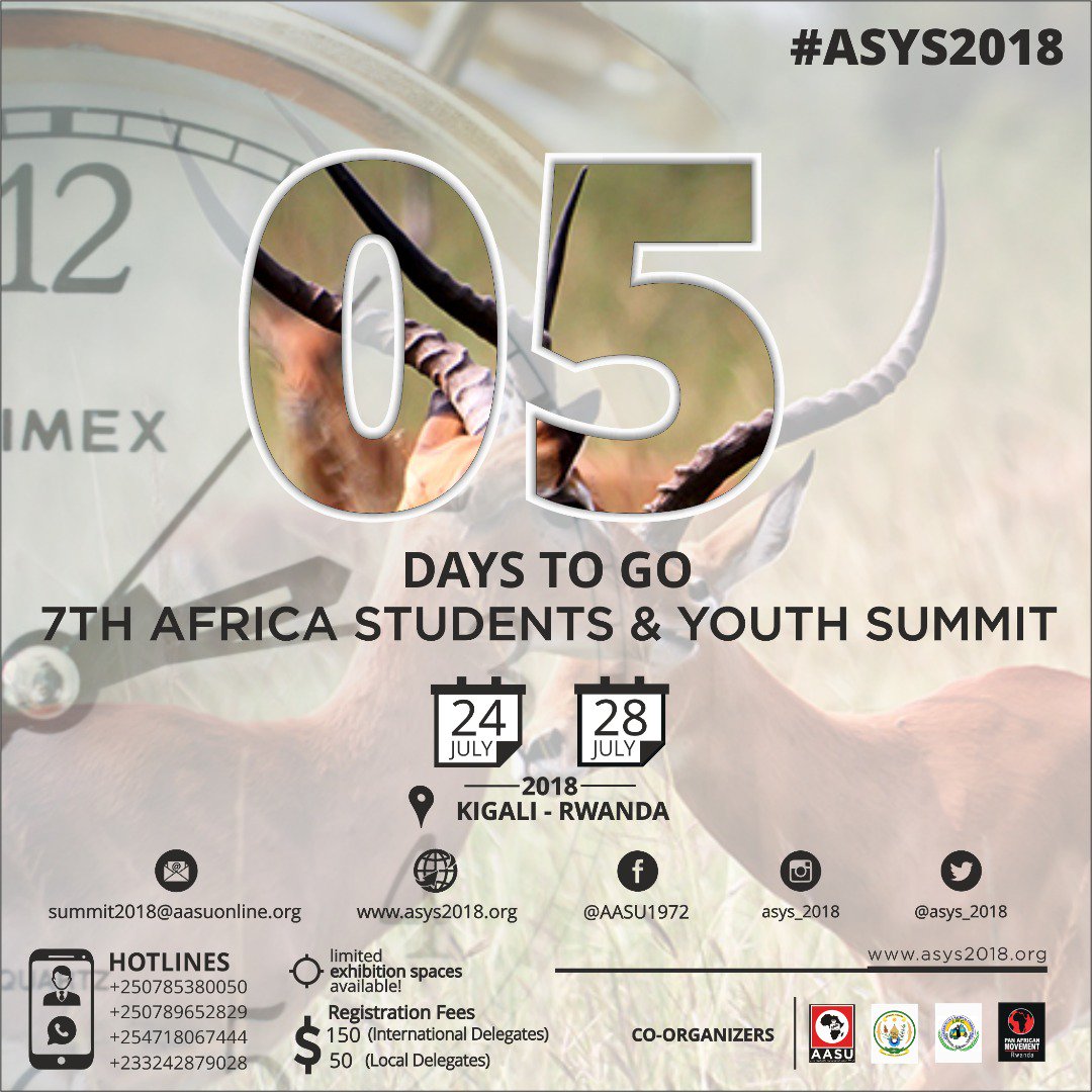 #ASYS2018:#CountdownToASYS2018 5 DAYS TO GO In 7th#Africa Students &#Youth#summit in#Kigali#Rwanda TOPIC : Reflecting on#Pan-#Africanism fathers vision and strategies to overcome the current challenges of the continent and build the Africa we deserve.pic.twitter.com/FzRAxyE7QK