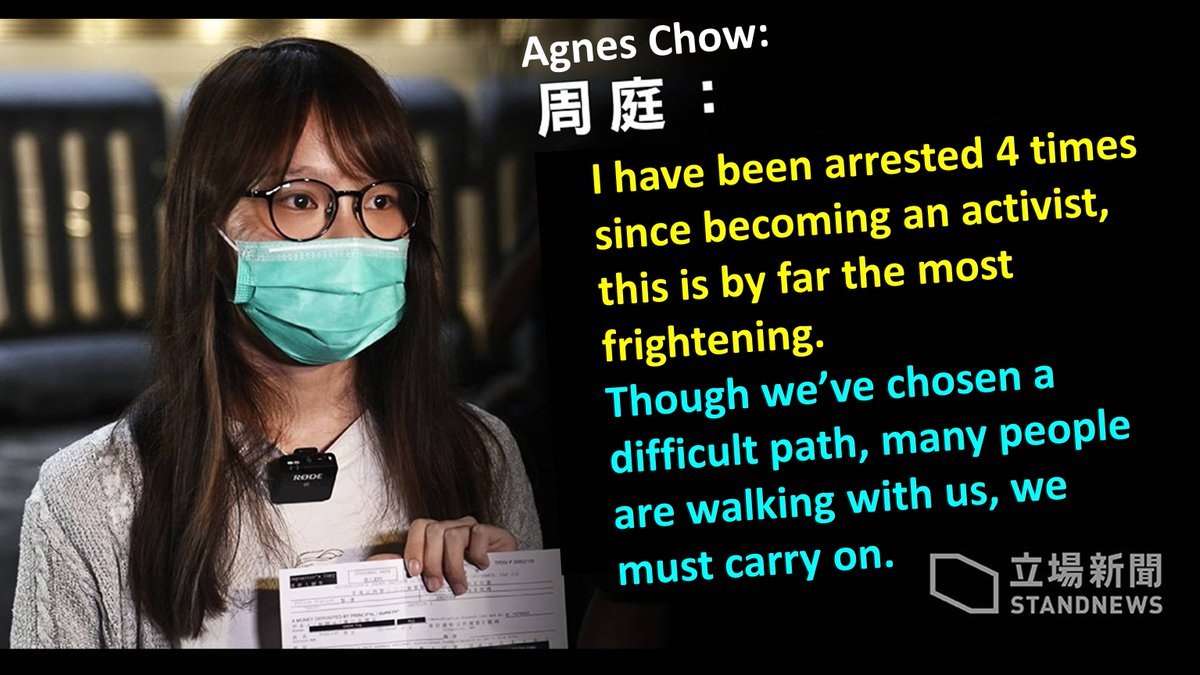 #AgnesChow was released on bail after being held in custody for about 24 hours. Police arrested@chowtingagnes Monday in connection with the new China-imposed#NationalSecurityLaw#周庭pic.twitter.com/8IEDhv0hbC -
