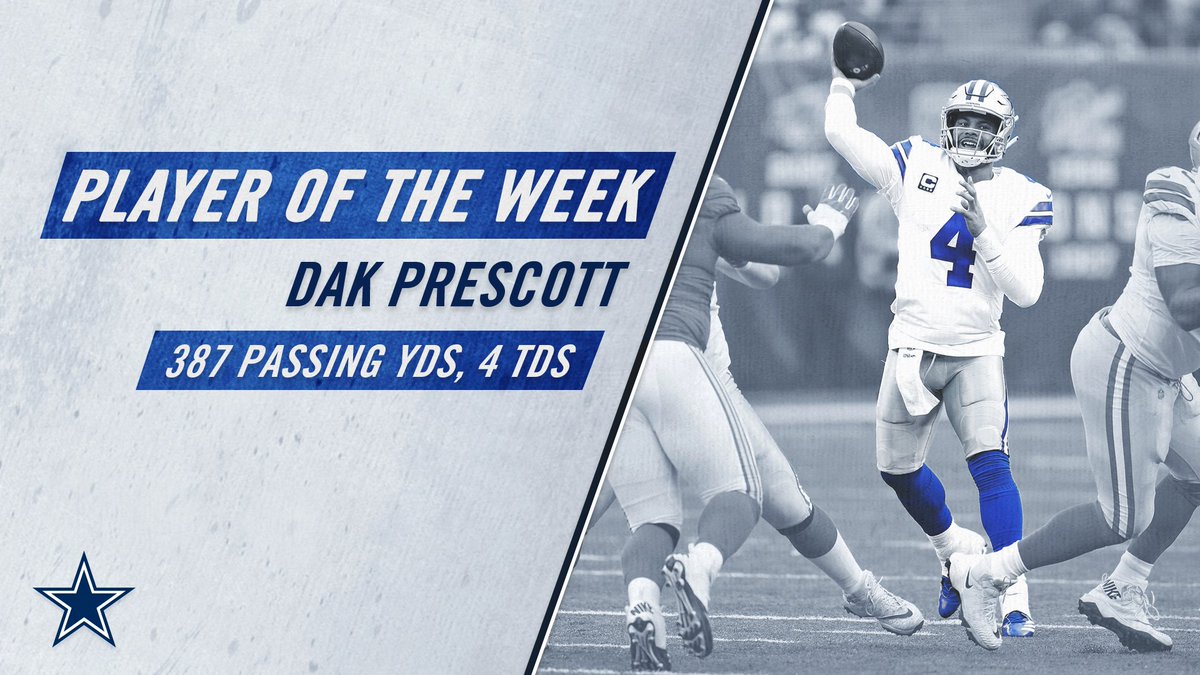 Dak Prescott was selected as Week 17's FedEx Air and Ground Player of the Week. He went 27 of 44 for 387 yards and 4 touchdowns (career high) with a 120.2 passer rating. It's his second nomination and win of the award for the 2018 season.