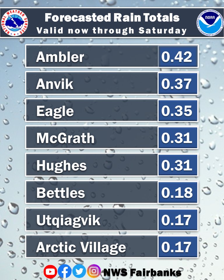 A front from the south and east will increase rain chances across the Eastern/Central Interior, north of Fairbanks. The front will merge with a northwest system and will move the rain to the Western Interior on Friday. Here are the forecasted rain totals through Saturday AM