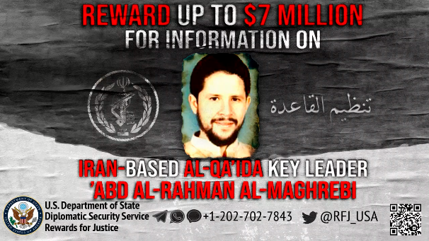#Iran-based#AlQaeda's leaders. And announcing Reward for Justice Program for up to $7,000,000 for Al Qaeda's Abd al-Rahman Al-Maghrebi, who is based in Iran. pic.twitter.com/YliyVbCux8