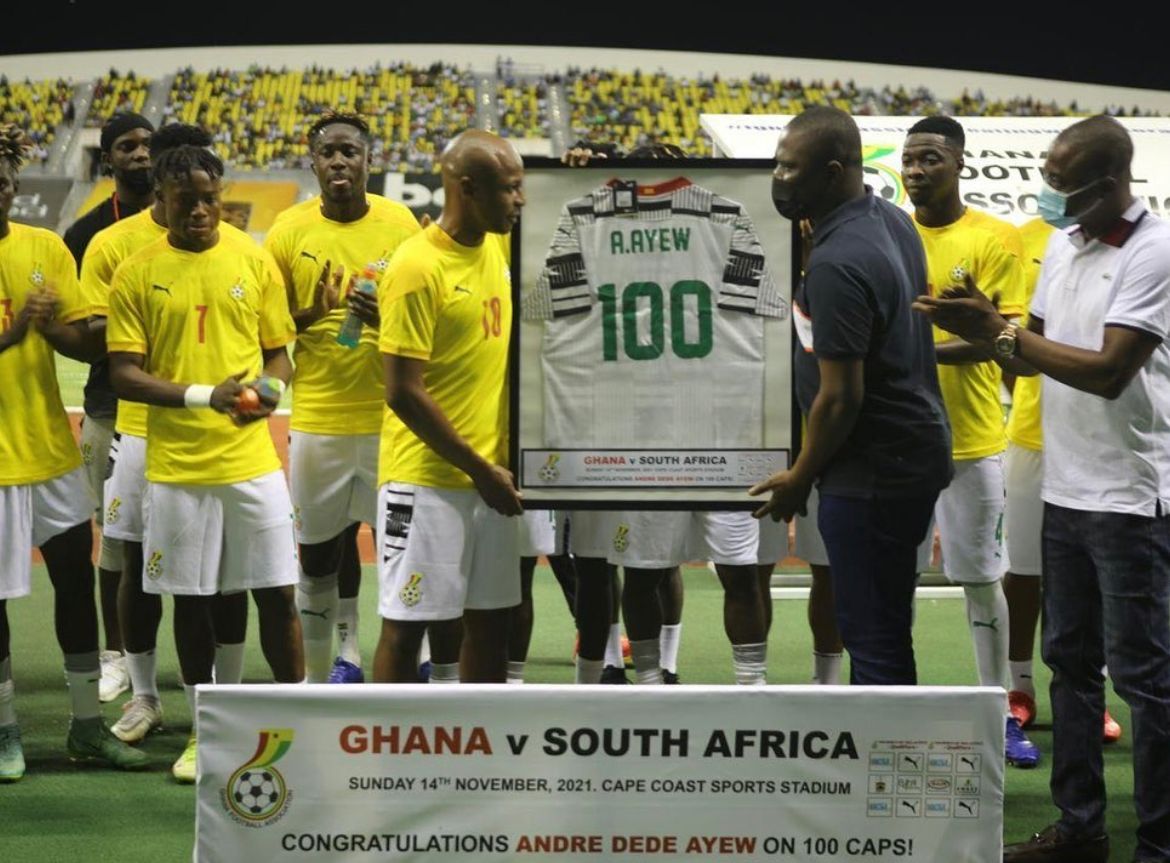 Ghanaian star Andre Ayew was honoured on reaching his 100th international appearance, on the sidelines of the game between his national team and South Africa in the 2022 World Cup qualifiers