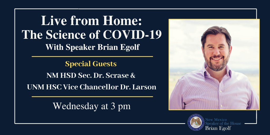 @NMHSD and@UNMHSC's Vice Chancellor Dr. Larson about what is the science and science fiction of#COVID19. Join us at 3 pm, Live on FB at: https://bit.ly/2B5J5bv#NMLeg#NMPol#AllTogetherNM pic.twitter.com/JQ8uRndSgs
