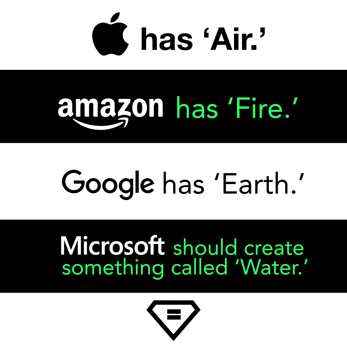 Apple has 'Air.' Amazon has "Fire." Google has "Earth." Microsoft should create something called "Water." Am I right? ............