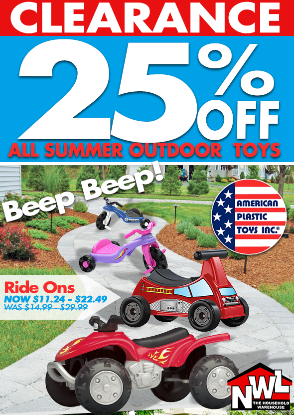 25% OFF ALL Outdoor Summer Toys! Ride-on, toy grills, beach toys, bubble machines, water guns &more cool toys!