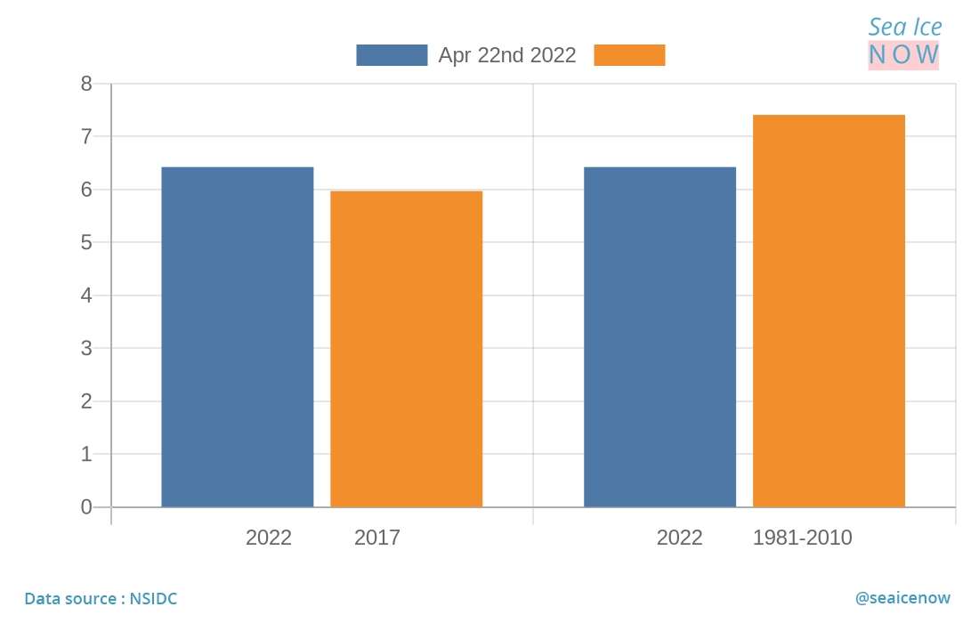 #Antarctic#SeaIce coverage for#April 2022 was 2.25 million square miles — 390,000 square miles below average — tying with 1981 as the fourth-smallest April Antarctic sea ice cover on record: https://bit.ly/3Nd8X5g@NOAANCEI#StateofClimatepic.twitter.com/Nq3OZkvC0C