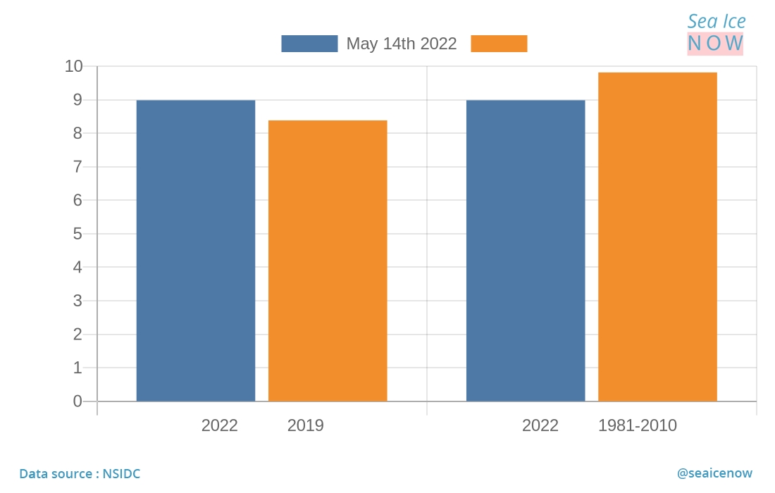 #Antarctic#seaice extent on May 14th 2022 was 8.98 million sq km. This is 0.83 million sq km below the 1981-2010 average and the 6th lowest extent ever recorded on this day of the year. This is 7.2% above the record low set in 2019 (8.38 million sq km)pic.twitter.com/h80HNSK3xU