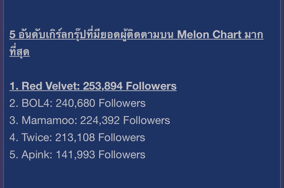 Top 5 most followed girlgroup on Melon 1. Red Velvet 2. BOL4 3. Mamamoo 4. Twice 5.