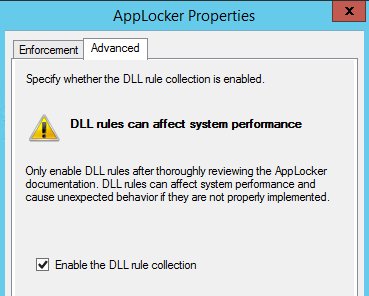 To all the sysadmins out there maintaining AppLocker. It DOES NOT affect performance to turn on DLL rule collection. Be smart, TURN ON DLL rules and whitelist them. Just do it!