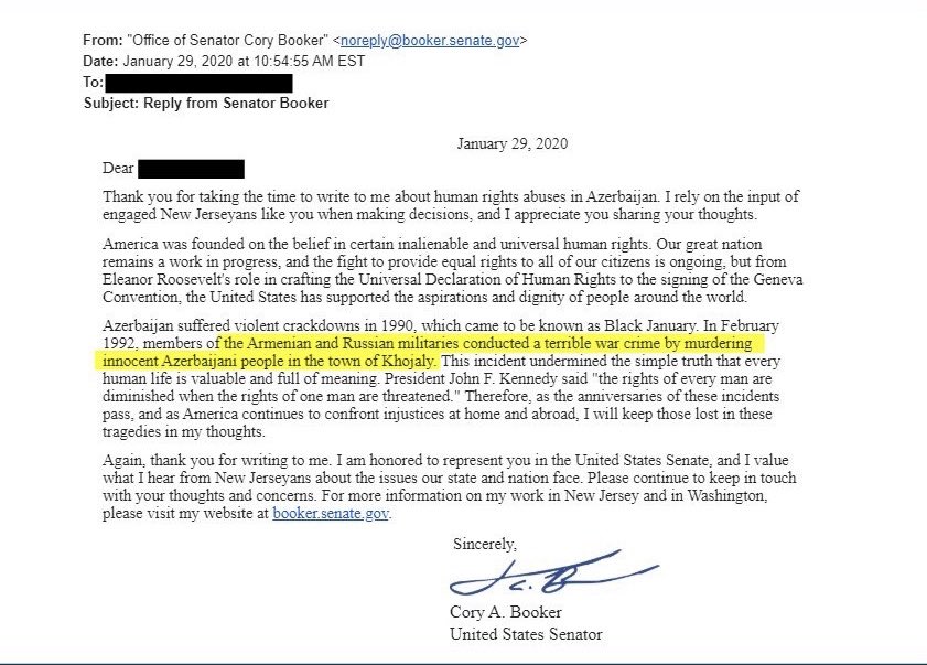 @CoryBooker sent response letters today to#Armenian Americans across New Jersey leveling false accusations against Armenians of "terrible war crimes." Call (202) 224-3224 and register your concerns. pic.twitter.com/RBQXBqGbEa