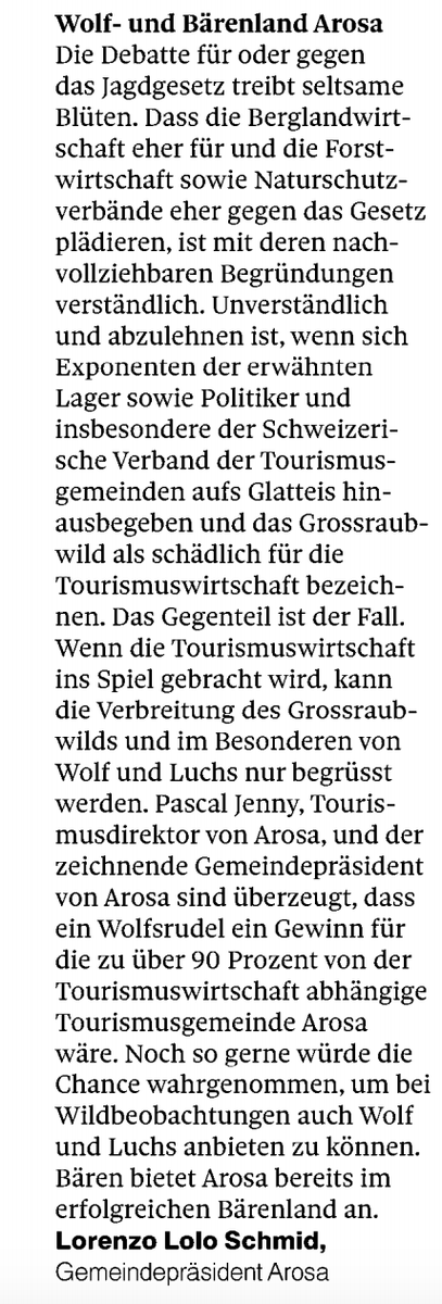 #Arosa spricht sich gegen das missratene#Jagdgesetz aus: "Wir sind überzeugt, dass ein Wolfsrudel ein Gewinn für die zu über 90 Prozent von der Tourismuswirtschaft abhängige Tourismusgemeinde Arosa wäre." Das sehe ich ähnlich.@JagdgesetzNein