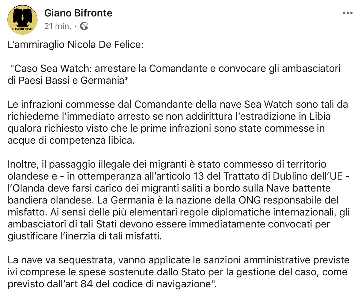 #arrestateCarolaRackete E SE LO DICE UN AMMIRAGLIO VUOL DIRE CHE LE LEGGI SONO CHIARE E GIA' C'ERANO PURE PRIMA DEL#DecretoSicurezzaBis. NON CI SONO SCUSANTI.#arrestateCarolaRackete#arrestateCarolaRackete#arrestateCarolaRackete#arrestateCarolaRackete https://twitter.com/estremo_sud/status/1144232988332441600 … -