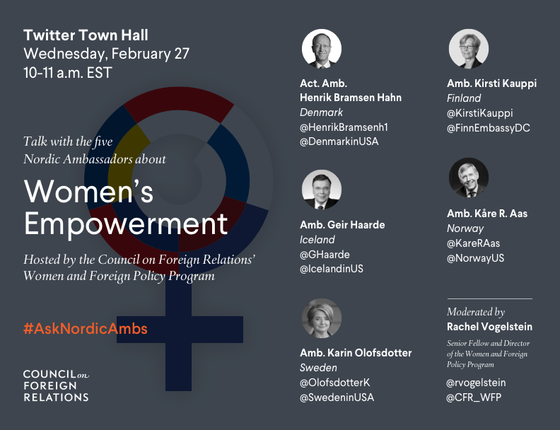 @CFR_WFP on 2/27 at 10-11am ET for a Twitter Town Hall with the Nordic Ambassadors on women's empowerment! Ask