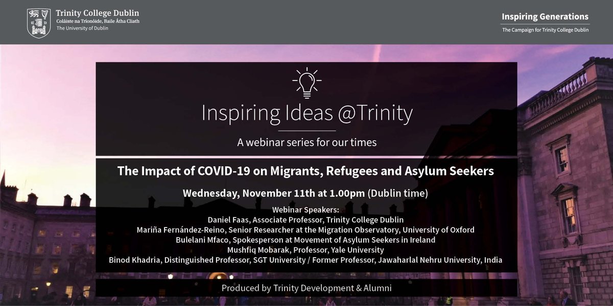 #Webinar Alert! Our next 'Inspiring Ideas @ Trinity' webinar will explore how#COVID19 has added to the further exposure of#migrants,#refugees and#asylumseekers. Register now for this important discussion! https://us02web.zoom.us/webinar/register/2416043306263/WN_-blCsg2OSeiTfg1973CkEQ …#InspiringGenerationspic.twitter.com/y3Jzz1QiMs