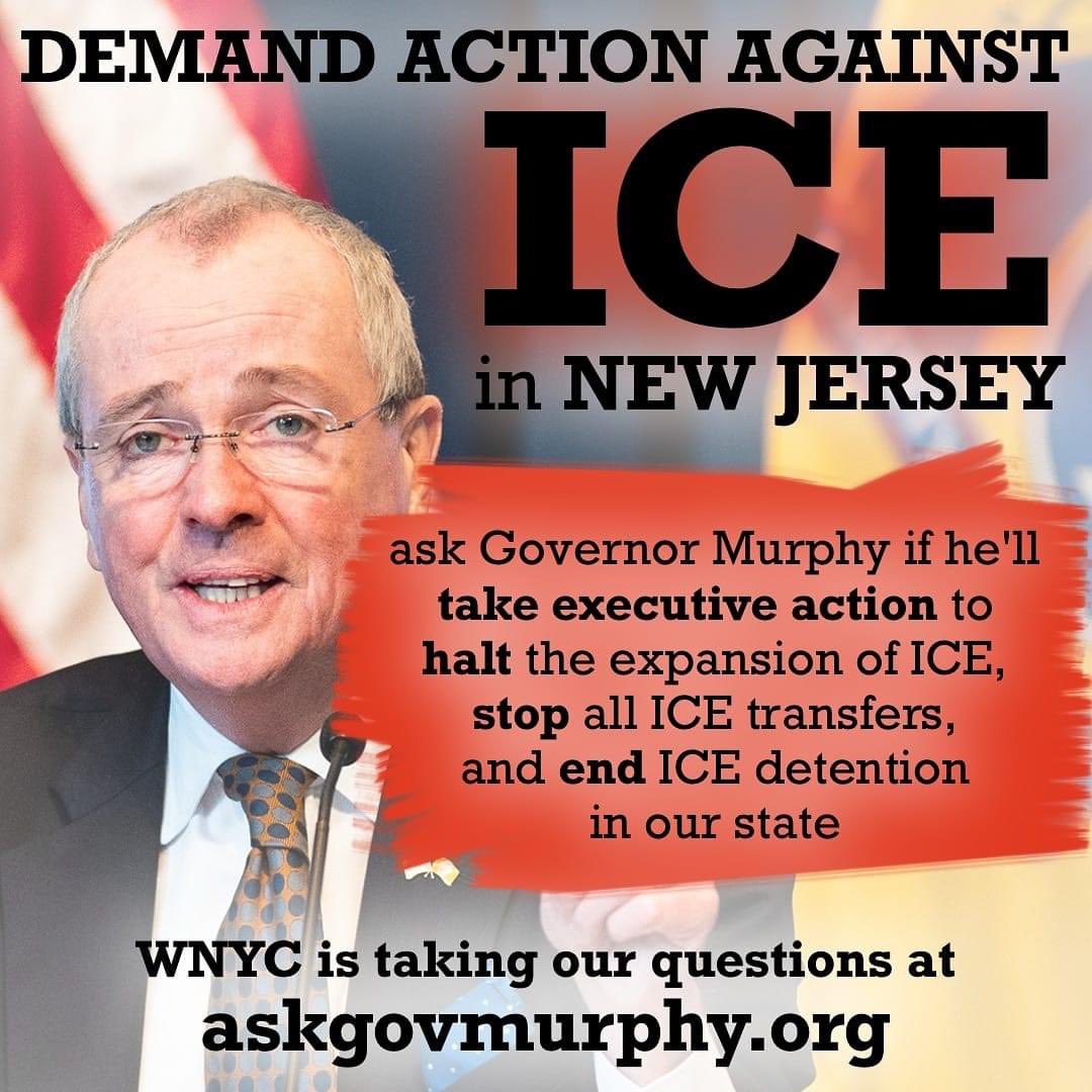Tonight at 7PM, WNYC will be airing a Q&A with Governor Phil Murphy Let’s use this chance to ask him to take executive action against ICE detention in NJ! Submit your question to http://askgovmurphy.com right now, so WNYC has to press Murphy on ICE.