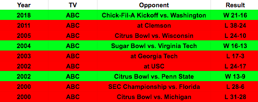 #Auburn Football is 3-6 in games played on ABC.#SportsCallAUpic.twitter.com/yRHwXASXQg