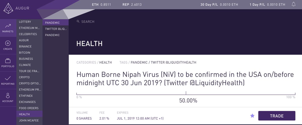 #Augur platform could exceed $1m USD and the # of markets exceed 1000 within 30 days - ETH network limits and unknown unknowns permitting.@PredictionsGlblpic.twitter.com/vMIbHyZ8vy