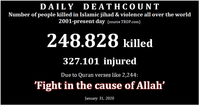DEATH COUNT for ISLAMIC JIHAD & VIOLENCE IN THE NAME OF ALLAH & AS COMMANDED & SANCTIONED BY ALLAH & MUHAMMAD. 2001- present day (January 31, 2020) I