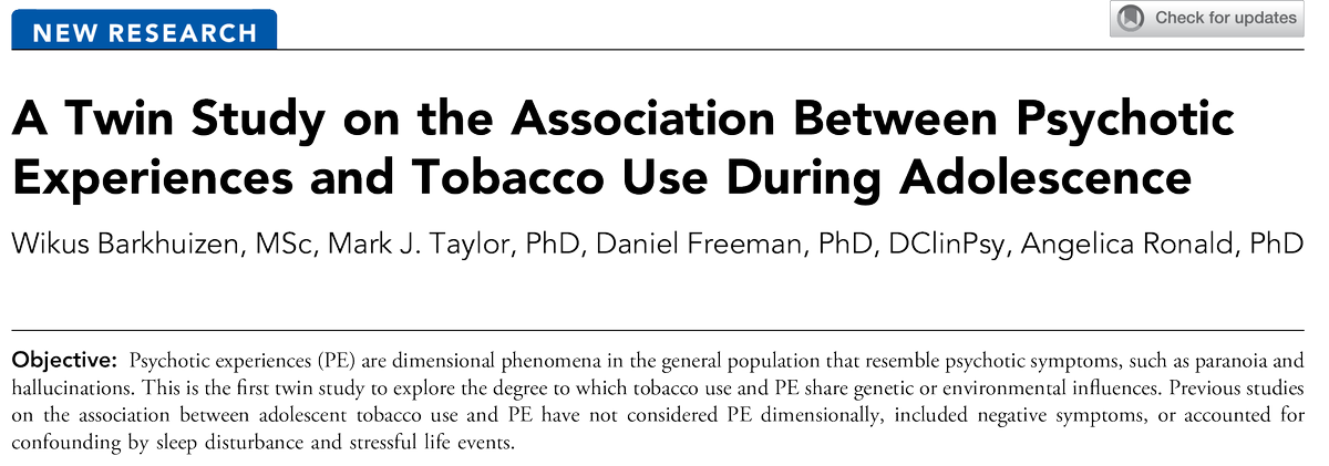 #JAACAP finds that shared#genetic influences explain most of the association between#tobacco use and psychotic experiences in#adolescents.#BBKresearch#hallucination@TedsProject https://www.jaacap.org/article/S0890-8567(18)31974-9/fulltext …pic.twitter.com/FxSXN9x1NW
