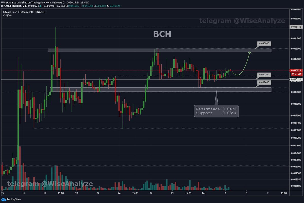 Bitcoin Cash chart update. Moving in a narrow channel. Nearest resistance at 0.0430, support at 0.0394. So far moderately bullish. Almost neutral.