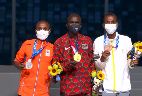 Por ello, esta resulta una hermosa postal para cerrar los Juegos: el podio con el histórico Eliud Kipchoge #KEN con el oro, y los amigos Abdi Nageeye#NED y Bashir Abdi#BEL pic.twitter.com/FDLqnIdpAd