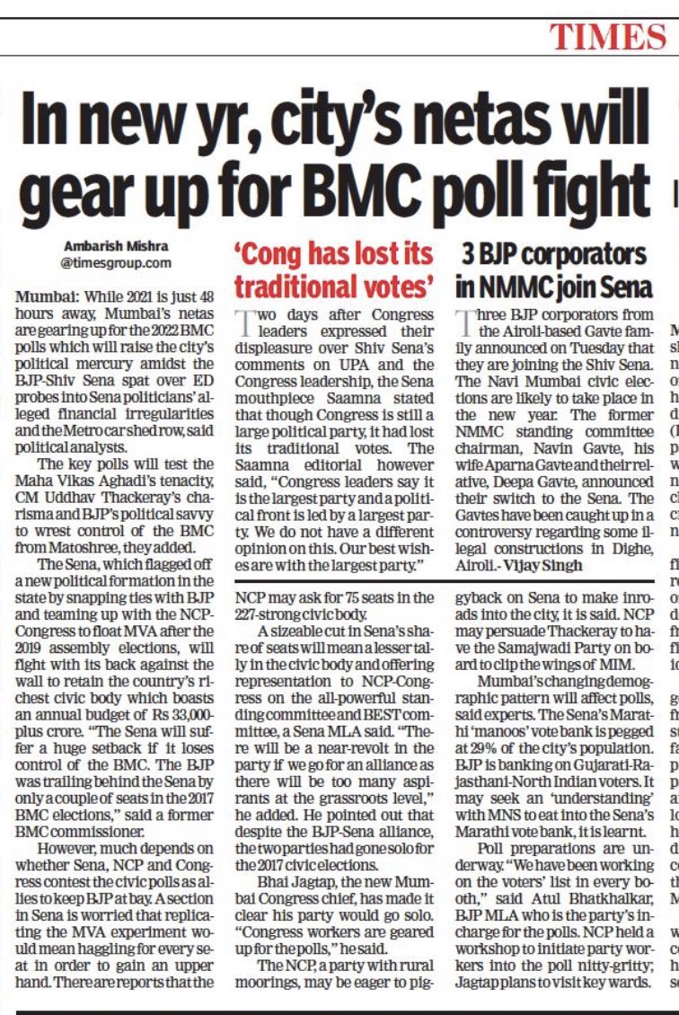 #Mumbai’s netas are already gearing up for the 2022#BMC polls amidst the#BJP-#ShivSena spat over ED probes into Sena politicians’ alleged financial irregularities and the Metro car shed row https://timesofindia.indiatimes.com/city/mumbai/in-new-year-mumbais-netas-will-gear-up-for-bmc-poll-fight/articleshow/80020408.cms …pic.twitter.com/os1wETLP1l