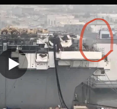 Long may she wave. From a 7am PST video, fires still burning, helos dropping water, fires burning through the skin of the ship, yet Old Glory is intact