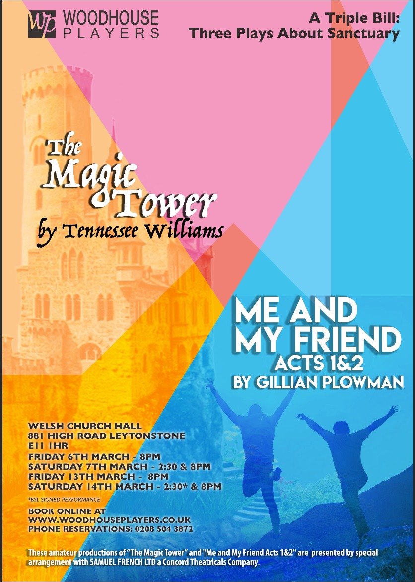 Flyer for our Triple Bill of three plays about sanctuary - "The Magic Tower" by Tennessee Williams and Acts 1 & 2 of "Me and My Friend" by Gillian Plowman. 6/7 and 13/14 March