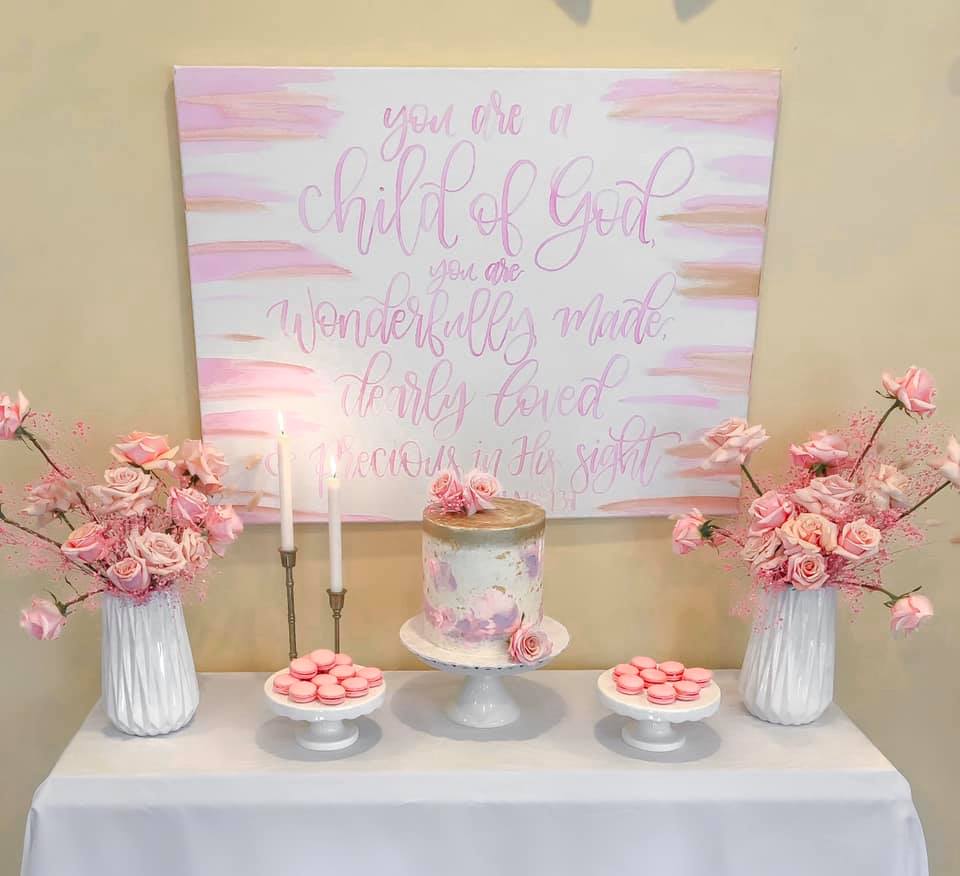 “You are a child of God. You are wonderfully made, dearly loved, and precious in his sight.” The sweetest little cake table for the sweetest little angel’s