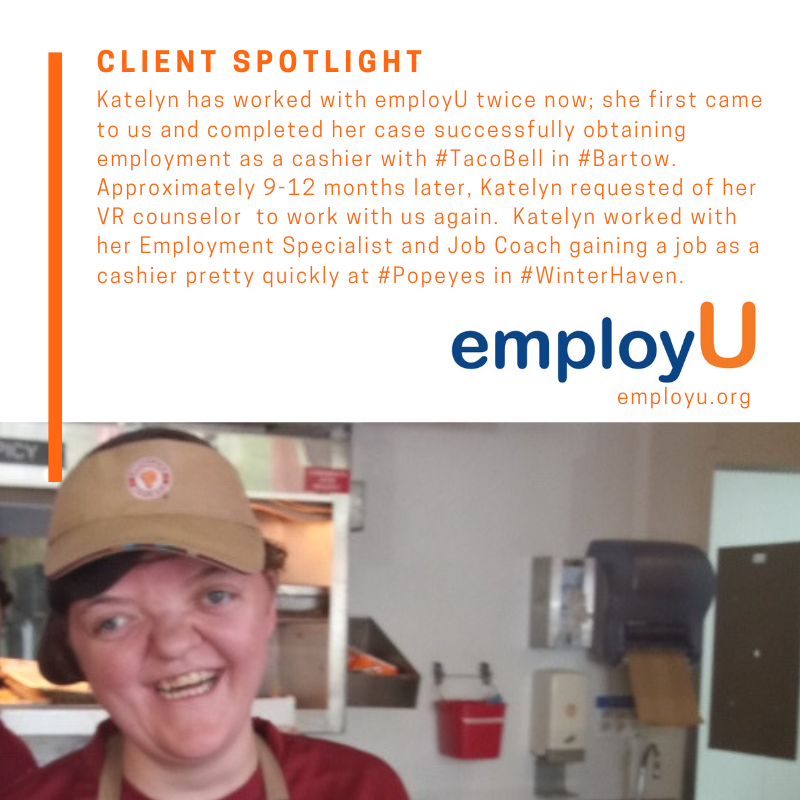 #ClientSpotlight "Katelyn has worked with employU twice now; she first came to us and completed her case successfully obtaining employment as a cashier with#TacoBell in#Bartow. Approximately 9-12 months later, Katelyn requested of her VR counselor to work with us again. pic.twitter.com/wvsOMJBHwX