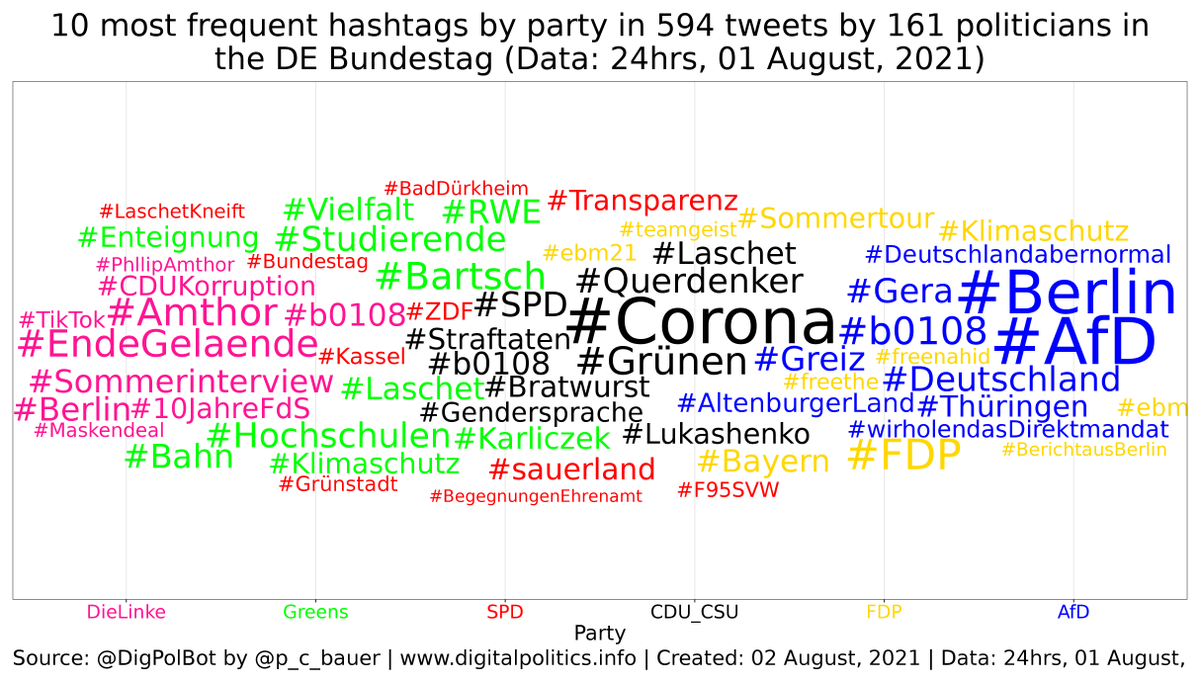 #Bundestag): Partys' MPs most used hashtags yesterday:#EndeGelaende (4 Tweets, DieLinke),#Bartsch (3 Tweets, Greens),#sauerland (2 Tweets, SPD),#Corona (8 Tweets, CDU_CSU),#FDP (3 Tweets, FDP),#AfD (7 Tweets, AfD).#Bundestagswahl#botpic.twitter.com/FVnXAfQomQ