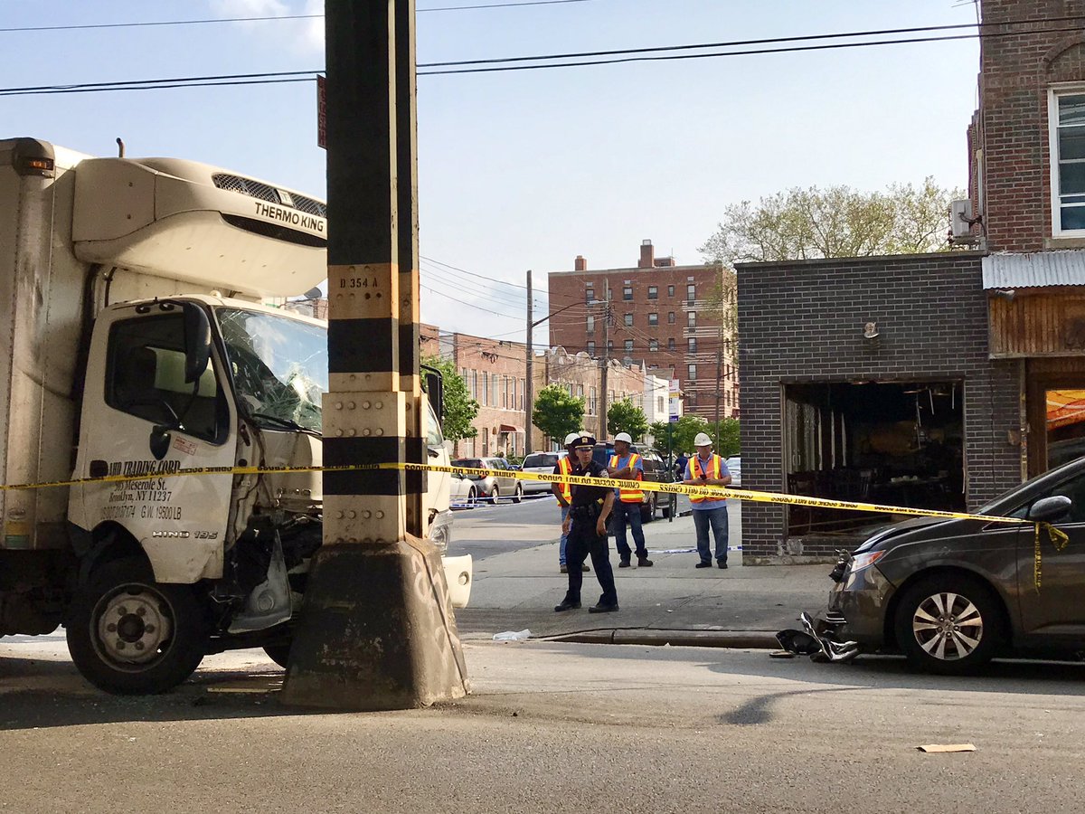 Box truck crashes into restaurant then backs up and hits subway pillar. Two people are injured