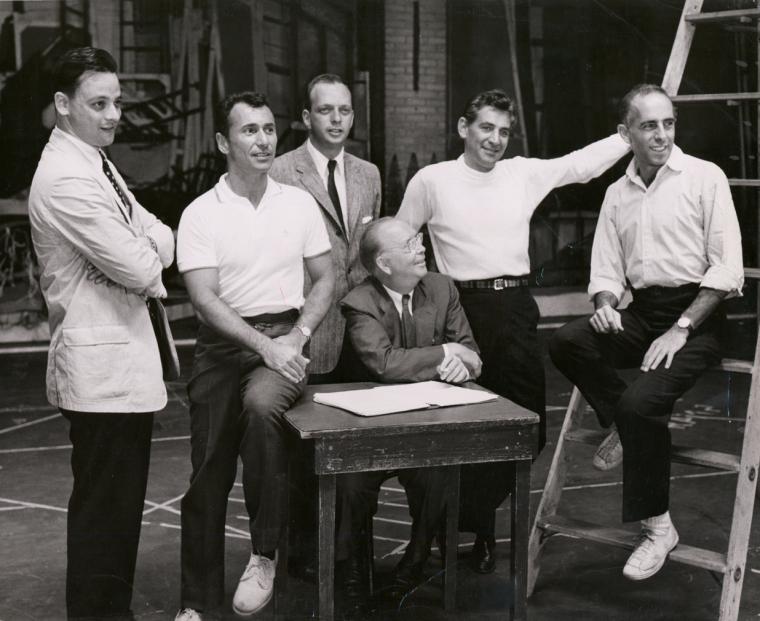 Remembering Arthur Laurents on his birthday. Stephen Sondheim, Arthur Laurents, Hal Prince, Robert Griffith, Leonard Bernstein and Jerome Robbins during rehearsal for West Side Story
