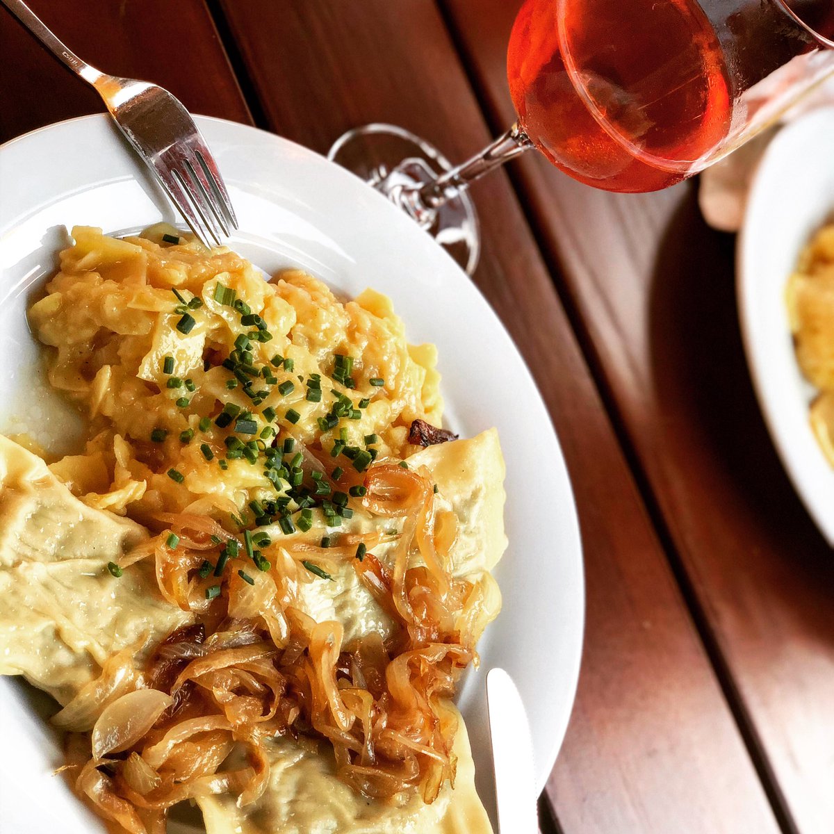 #Schwäbischer Abend im#Besen mit#Maultaschen,#Kartoffelsalat (auf gar keinen Fall mit Mayonnaise) und#Roséwein vom Neckar.pic.twitter.com/g7L2uF8upo