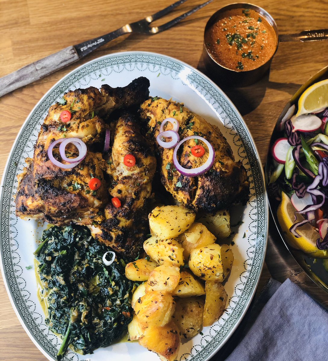 Sunday’s roast had a little twist. Beer can tandoori chicken, roasties spiked with cumin, crushed chillies and methi, creamed saag, butter chicken gravy and salad for freshness and crunch. Bring on the leftovers! https://www.instagram.com/p/B8Gge5tht_0/?igshid=wcd6srehltjr …