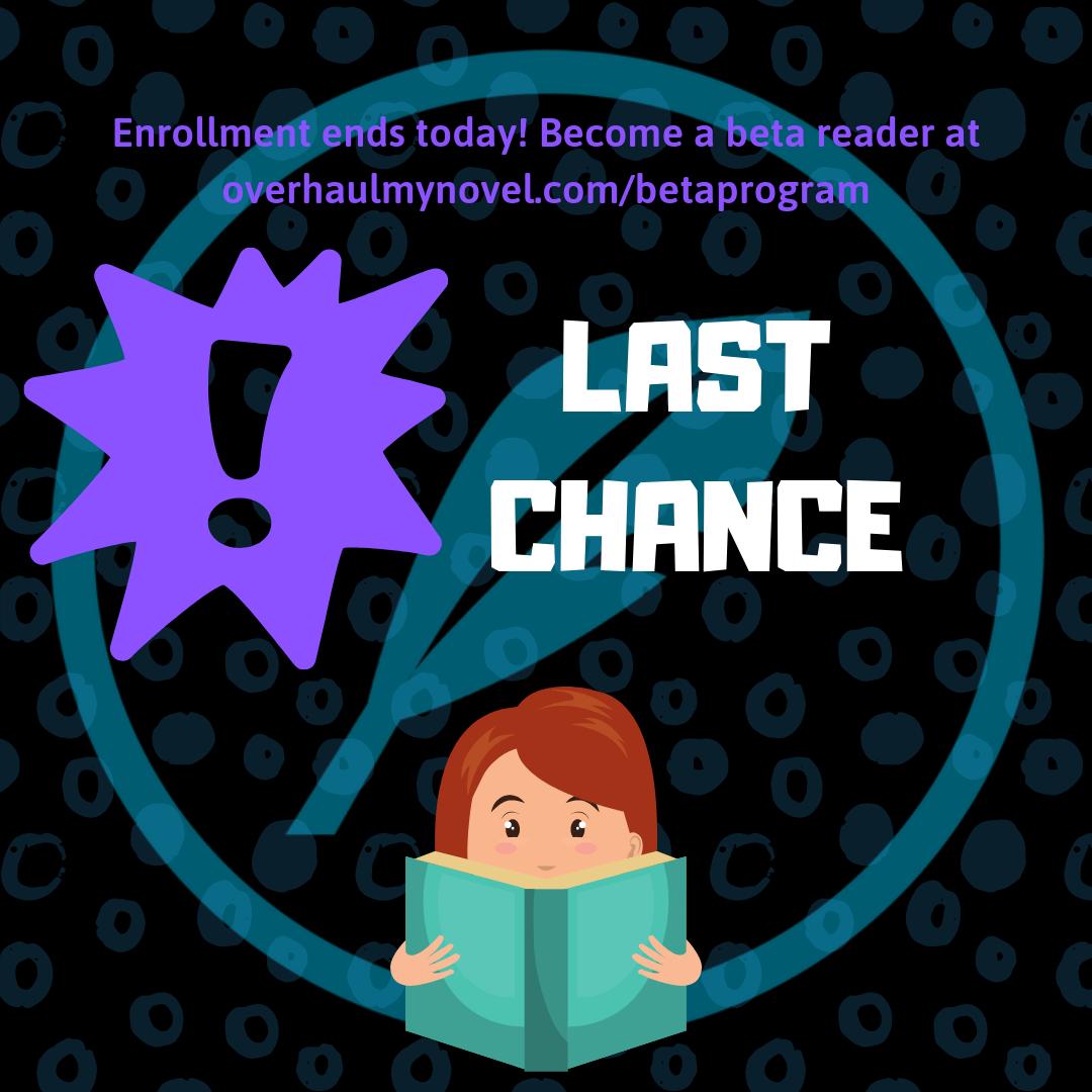Happy as it makes me to have new signups every month, it's just not practical right now. As such, today is the last day for a while that we'll be accepting new beta readers into the program. Sign up at http://overhaulmynovel.com/betasignup