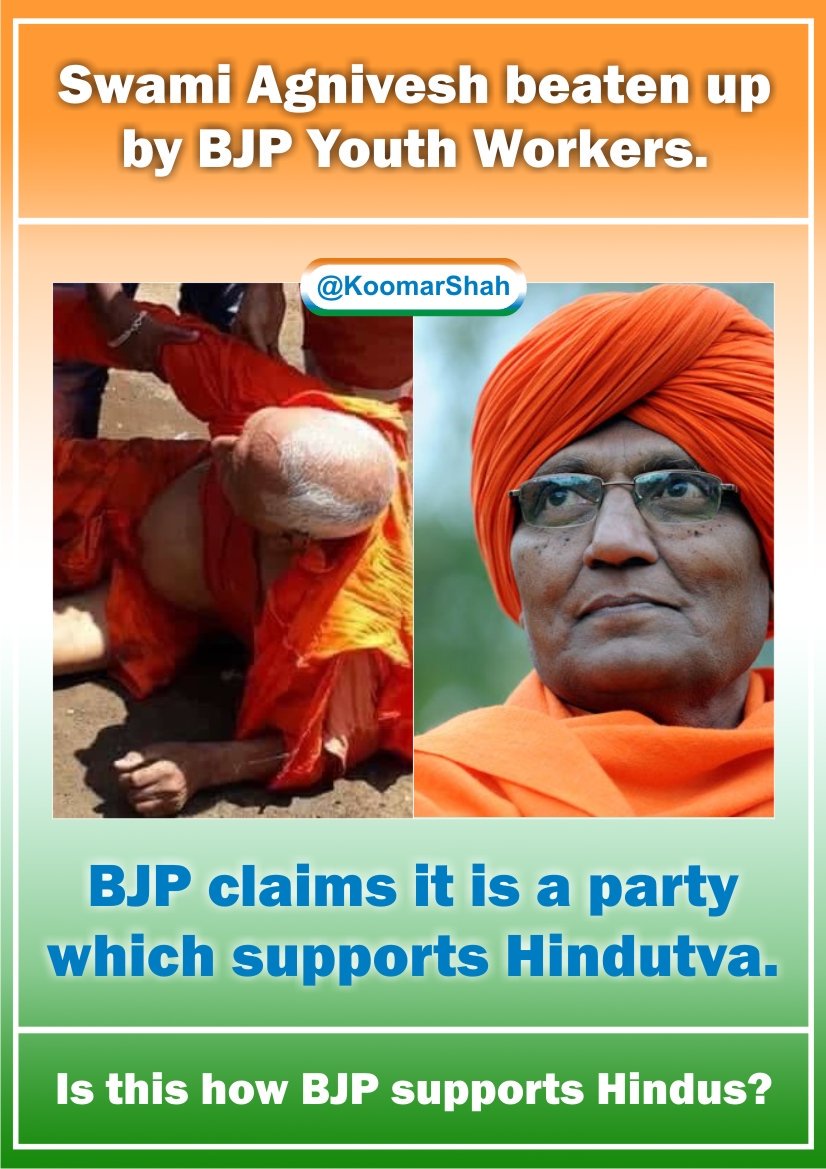 @BJP4India goons gives a clear message to Indians:- "YOU ARE HINDU ONLY IF YOU SUPPORT BJP."#AntiHinduBJP#SwamiAgnivesh#SwamiAgniveshAssaulted#BharatBachao pic.twitter.com/6x5AV84jLF