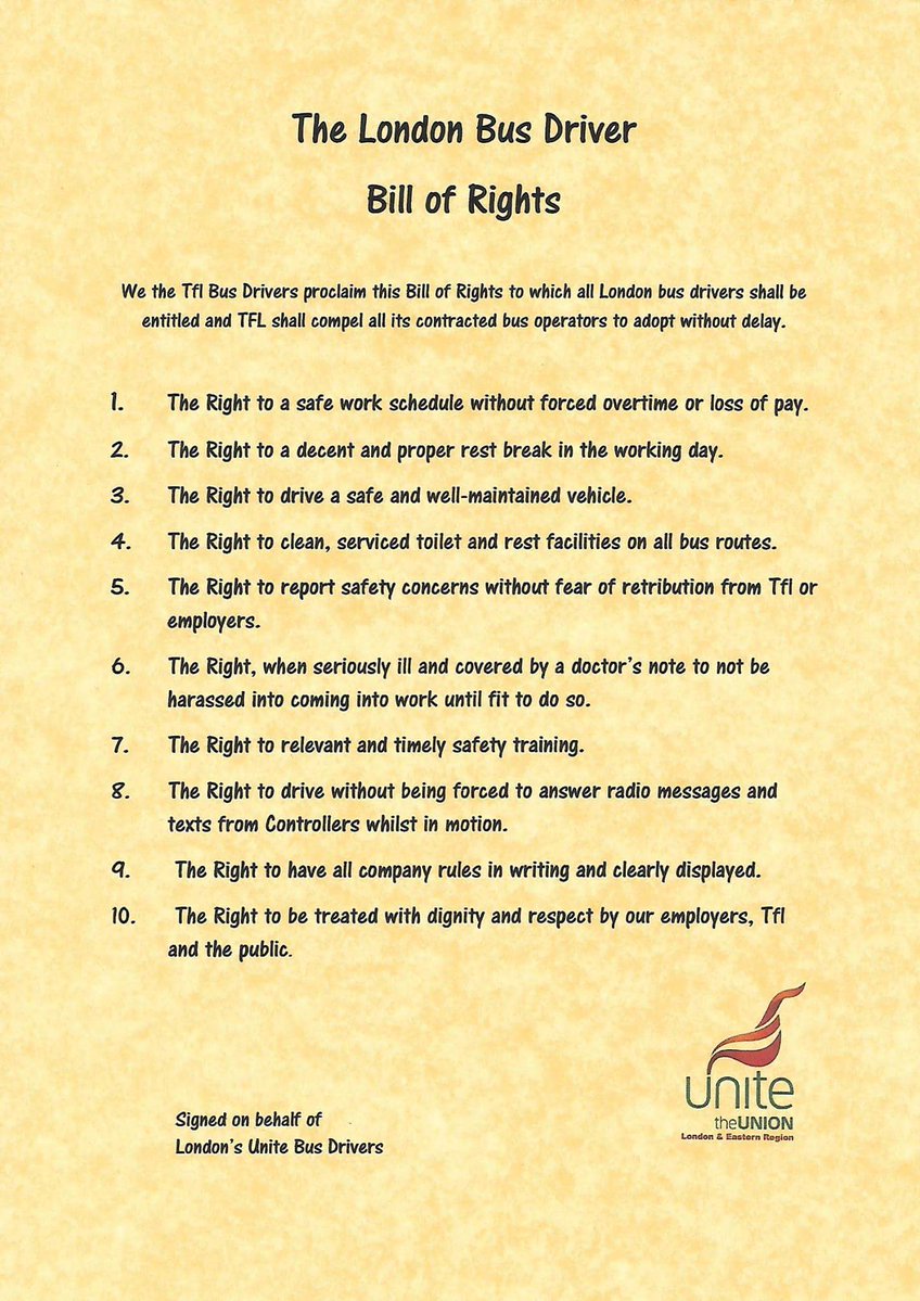 #BillOfRights has 10 "Rights" London Bus Drivers presented to@SadiqKhan on 14SEP17. Number 7 "Right to Timely & Relevant Safety Training" which Bus Drivers obviously think they don't get.@MLiebreich "chilling"#BusSafety Memo suggests they're right http://saferoxfordstreet.blogspot.com/2018/10/nearly-two-sandilands-per-year-michael.html …pic.twitter.com/ZdYPUUI689