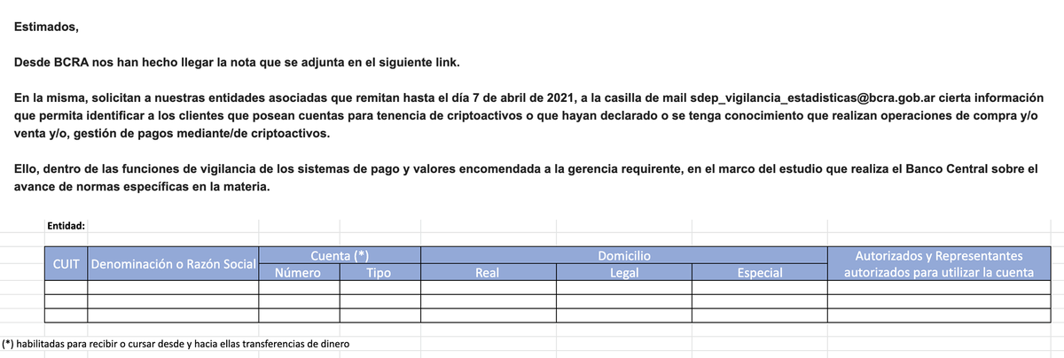 Argentina's Central Bank (the one with 50% annual inflation) is requesting banks to complete a sheet to identify clients known to have, trade or do payments with cryptoassets. Here a message from a bank association to their members (leaked by the local